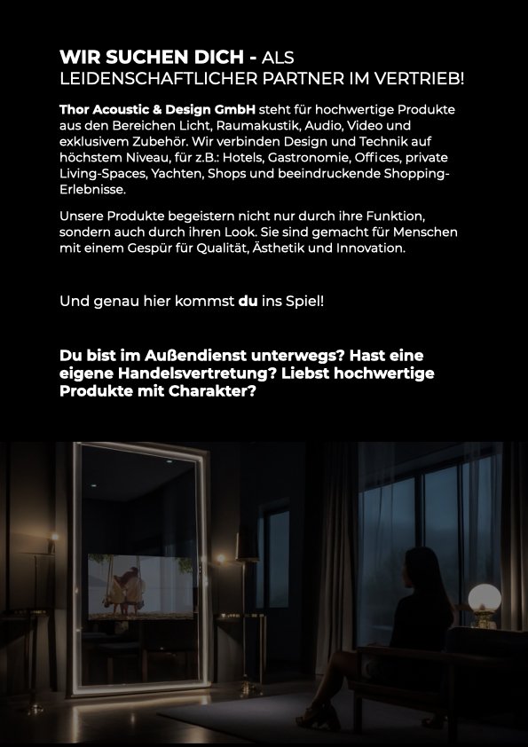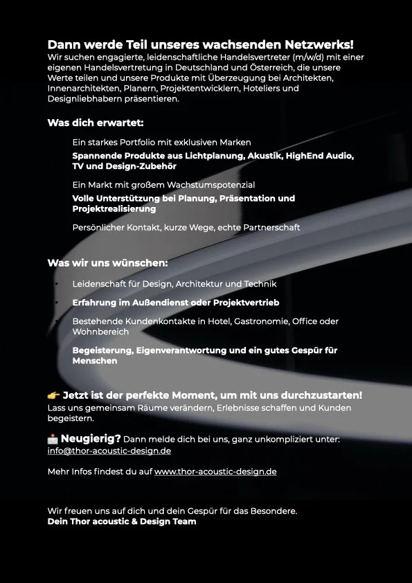 Thor Acoustic & Design GmbH steht für hochwertige Produkte aus den Bereichen Licht, Raumakustik, Audio, Video und exklusivem Zubehör. Wir verbinden Design und Technik auf höchstem Niveau, für z.B.: Hotels, Gastronomie, Offices, private Living-Spaces, Yachten, Shops und beeindruckende Shopping-Erlebnisse.