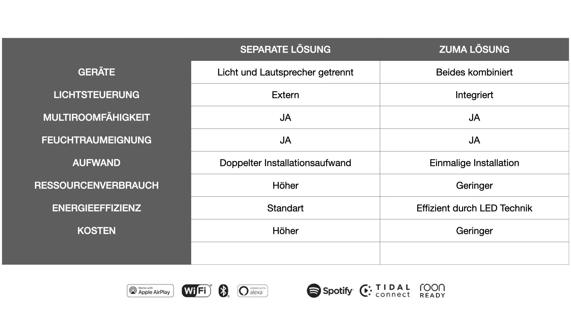 ✅ Nachhaltigkeit: Mit der Kombination von Licht und Klang reduziert ZUMA den Bedarf an separaten Geräten und damit den Ressourcenverbrauch.